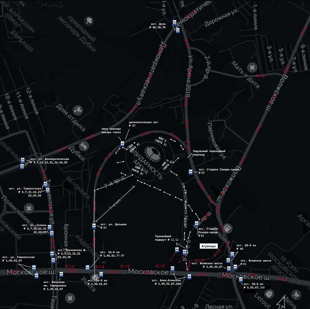Ближайшие к стадиону остановки — «Стадион Самара Арена», «Улица Алма-Атинская»